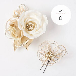 【個性的上品な髪飾りセット】ゴールドとシルバーの2色をご用意しており、つまみ細工、ふんわりリボン、可愛い造花や和玉、パールアレンジをあわせます。パールチェンはクネクネと形を変えられ、全体的に個性的で華やかな美しさを感じ