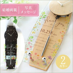 お花に囲まれたやさしいイメージの振り子時計。ご希望のメッセージをガラス面にプリントします。中心に大きくThank You(変更可能です)の文字と下にお名前や日付を入れます。結婚式に親や祖父母へ贈る記念品としてお使い下さ