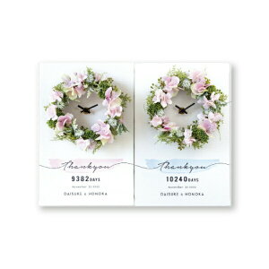 デザインが繋がる一対のメモリアル時計です。 リース中央のアクリルパネルには生まれてから挙式日までの総日数と、感謝のメッセージ(定型文)、新郎新婦のお名前・記念日が入ります。 「ありがとう」の言葉と一緒に...