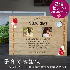 写真の送信はご注文後にお願いします。受注番号が必須となります。 木製プレート型時計付きの感謝状です。2個セットでご用意致します。送料も無料です。新郎用、新婦用で2個ペアの価格でお得になっています。 デザインは2種類ございま