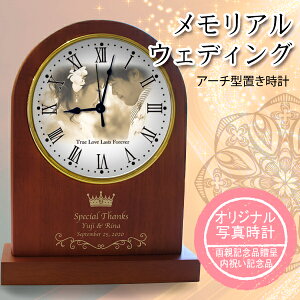 ギフト対 応 結婚式にご両親へのサプライズ!記念品贈呈にお使い頂ける置き時計です。 文字盤には写真をカラー印刷、木枠にはご希望の文字を彫刻します。 重厚感のあるアーチ型の置き時計、明るい茶色木素材は年数がたつと落ち着いた色