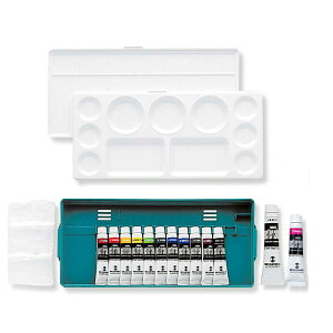 サイズ:300×138×35mm Wパレット付ポリプロピレン製ケース 付属品:布巾 11色セットにホワイト20ml、マゼンタ11mlがついております。 入組み色(白を除く) カーマイン、バーミリオン、イエローディープ、レモンイエロー、...