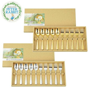 ティースプーンとケーキフォークの10本セット♪ピーターラビットを皿中に大胆にデザインしたカトラリー。金メッキと銀メッキで華やかな色合いです。