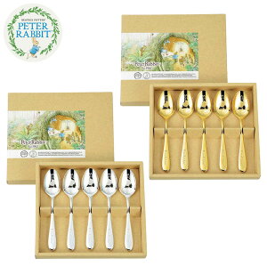 ティースプーンの5本セット♪ピーターラビットを皿中に大胆にデザインしたカトラリーです。金メッキと銀メッキで華やかな色合いです。