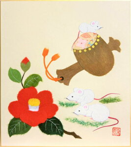 ■子と小槌 災害への予知能力があると言われ、 火事や地震が起こる前に安全な場所へ 移動すると言われるネズミ。 未来を知る神獣として大黒様の使者と されています。 また多産で繁殖力が強いため 子孫繁栄のシンボルとも
