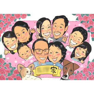 似顔絵で家族やペットと一緒に還暦祝いや古希、喜寿、傘寿、米寿などの長寿のお祝いを記念するギフト 家族の絆を描く贈り物 似顔絵集合写真風 還暦祝いプレゼント 記憶に残る贈り物 祖父母や両親の長寿のお祝いを特別な思い出にするプレゼント