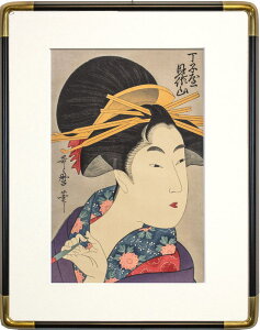 ■丁子屋 見佐山 美人画の第一人者である歌麿は、女性の上半身を 大きく描く「大首絵」という表現方法を考案し、 人気を博しました。 繊細で品のあある描線で、女性の仕草や表情を 華麗に表現したのが特徴です。 本作は