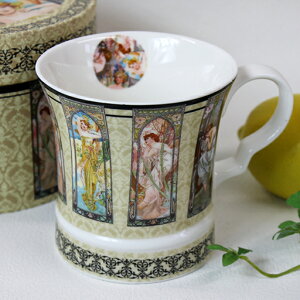 商品名 プレゼント用リボンの丸型BOX入り♪ 絵画マグカップ<時の流れ・アルフォンスミュシャ> サイズ マグ:巾12cm*直径9cm*高さ9cm 箱:直径13cm×高さ9.5cm 容量 300ml 仕様...