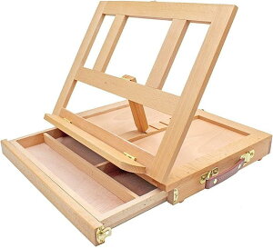アトリエや屋外で絵を描く際に、筆や絵の具などの画材を引き出しに収納して持ち運べる折りたたみ式木製卓上イーゼルです。持ち手付きですのでカバンの様に持ち運ぶことができます。材質は耐久性に優れたブナ材(ビーチ)製です。ブナ