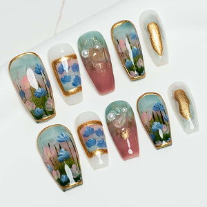ロング バレリーナ 緑 グリーン 蝶 花 人気 3D おしゃれ 可愛い デザイン つけ爪 付け爪 収納ボックス付き 10枚入 (XS, #31 絵画・花の海)ブランド色#31 絵画・花の海モデルFN-...