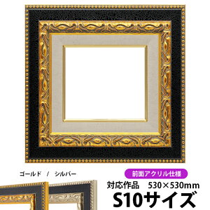 商品名 油絵用額縁 9370 S10(530×530mm)ゴールド 前面UVカットアクリル仕様 色 ゴールド その他の色 シルバー 商品情報 サイズ:S10(530×530mm) 縁幅:76mm(ライナー部分含む) 縁厚:56mm(ド...