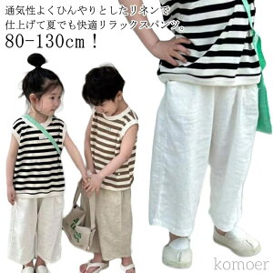 80-130cm!通気性よくひんやりとしたリネンで仕上げて夏でも快適リラックスパンツ。ワイドパンツなので小さなお子様もお着替えがしやすいゆったりストレートシルエットで、カジュアルすぎない印象に仕上げました。どんなトップスとも相