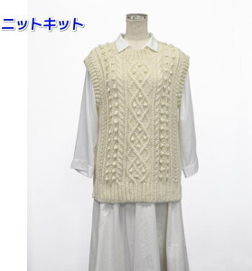 釣谷京子さんデザイン! ベビーアルパカ混のエブリディアルパカで編むベストのニットキット(編みものキット) 毛糸と編み図付きの着分セットです 伝統的なアラン模様に木苺の実のような玉編みが可愛いデザイン! 裾にはスリットが入り