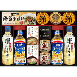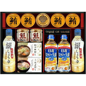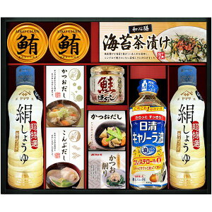 ●商品名/ヤマサ 絹しょうゆ 減塩 日清 食用油 缶詰 瓶詰 出汁 KI-90R2●商品内容/ヤマサ絹しょうゆ(450ml)×2、かね七かつおだし(4g×5)、かね七こんぶだし(4g×5)、鮭ほぐし(50g)×2...
