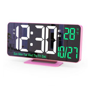 [6.7インチのピンクの目覚まし時計]このかわいいピンクの卓上時計は、ミラー時計スタイルの6.7インチのディスプレイ、デュアルアラーム、12/24時間形式、日付、曜日、秒、温度(°F/°C)、および自動/手動調光機能があり、女の子の寝...