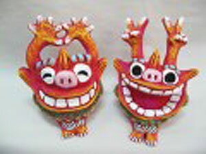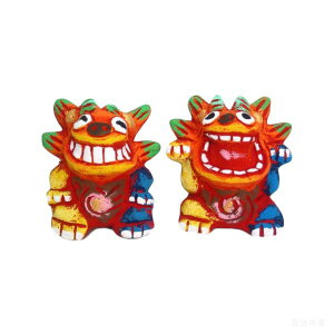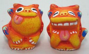 オスは大きな口を開けて幸福を招き入れ、メスは口をしっかり閉じて幸福を守るといわれています。赤は活力!くじ運UP!サイズ: 内容:シーサー×2/4×6.6×7cm ボール箱箱: