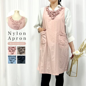 胸元のフラワーモチーフがエレガントな印象のエプロン。かすかに光沢のあるナイロン素材が華やかさをプラスしてくれます。着ていることを忘れてしまいそうな軽やかな着心地も特徴です。ナイロン素材で速乾&水を弾いてお手入れかんた