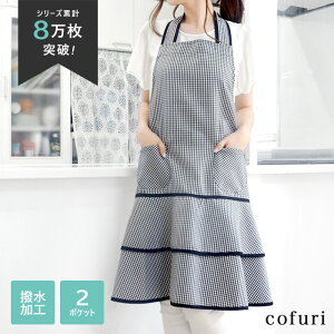 華やかなお花パッと咲いたようなお花が並んだかわいいエプロン。ポケットや裾のフリル使いが女性らしい。シンプルな洋服に着けるだけで華やかに。チュニック感覚で使える。 水仕事も安心撥水加工がされていて、ガーデニン