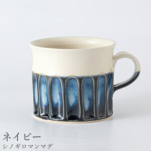 【シノギロマンマグ(ネイビー)】 シノギロマンマグは、和と洋の要素を取り入れたデザインが特徴的なマグカップです。 シノギロマンとは、陶器の表面に施された縦の溝を指し、日本の伝統的な技法である刷毛目のような効果を持ってい