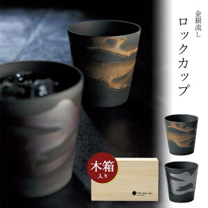 【金銀流し ロックカップペア(木箱入)】 手仕事ならではの薄造りで、質感高いロックカップ。 焼きしまった黒土に、氷の音がよく響きます。 ─┘─┘─┘─┘─┘─┘─┘─┘─┘─┘ 【商品詳細】 ■セット内容 カップ×2 ■サイズ φ9