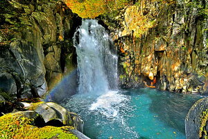 【思いの滝】 土湯温泉から徒歩で約75分。山津波によって生まれたといわれている男沼、女沼があります。 思いの滝は女沼から600mほど奥に行ったところにある、二段に落下する滝です。 男沼から仁田沼を抜けて女沼を結ぶハイキングコース