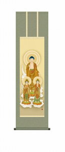 掛け軸 阿弥陀三尊佛 解説 阿弥陀如来を中尊とし、その左右に脇侍の観音菩薩と勢至菩薩を配する三尊の安置形式。観音菩薩は阿弥陀如来の「慈悲」をあらわす化身とされ、勢至菩薩は「智慧」をあらわす化身とされる。 作者 高見蘭石(三美