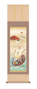 掛け軸 赤富士吉祥宝船 解説 赤富士を背に純白の丹頂鶴が飛翔し、龍神の船首を持つ宝船には七人の福徳の神様「七福神」が集います。宝船に乗ってやってくる七福神は、枕の下にその絵を敷いて寝ると良い初夢が見られるといわれてきた縁