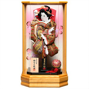 間口32×奥行24.5×高さ54cm。『西陣金襴/さくら金彩押絵羽子板』を、背景に桜蒔絵・摘み花付ケースにセットして、アーバンスタイル羽子板ケースに仕上げました。