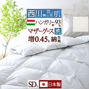 羽毛布団 2枚合わせ セミダブル 西川 マザーグース 羽毛ふとん ハンガリー産 DP460 大増量1.5kg 綿100% 超長綿 1年中使える オールシーズン 日本製 セミダブルサイズ