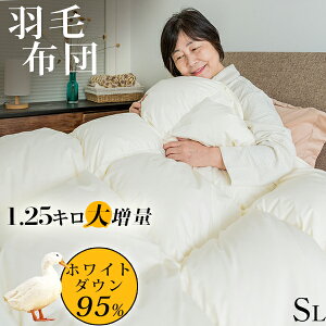 この羽毛掛け布団の商品仕様 サイズ 幅150x長さ210cm (シングルロング) 詰め物 ホワイトダックダウン95% スモールフェザー5% 1.25キロ充填 側生地 ポリエステル82%綿18% 製法 立体キルト・ループ数8箇所・パイピ...
