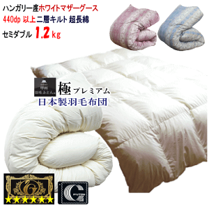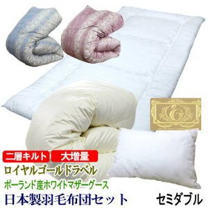 こだわりの国産品。ポーランド産ホワイトグースをセミダブルは1.4kgも使用した高級感あふれる羽毛布団です。品質はロイヤルゴールドラベル、品質保証書付きの羽毛布団です。かさ高165mm以上でふんわり、側生地も超長でツヤツヤ、最高級の
