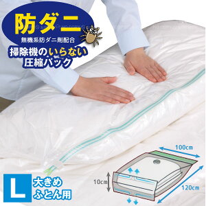 無機系防ダニ剤を配合した圧縮パック。 押すだけでも、掃除機でも、どちらでも圧縮できます。 大きめふとん用のLサイズです。 (シングル/ダブル)掛け布団なら約1枚を収納可能。 羽毛布団にも使用できます。(ダウン70%以上) 「楽ジッパ