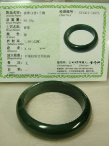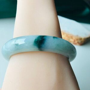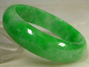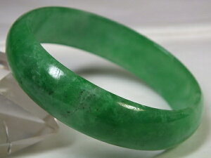 重さ:63.7g ●緑色が綺麗なミャンマー翡翠。透明感の有る氷種です。飾り彫りのないシンプルなデザインですが、微妙に濃淡が場所によって違う、飽きのこないバングルです。 ●中国では翡翠の腕