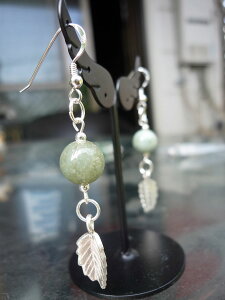 本翡翠10mm玉と葉っぱのカレンシルバーのスイングピアスです。フック式。とてもバランスの良い組み合わせです。フック部分から6.1cm。ミャンマー産本翡翠も綺麗な色です。