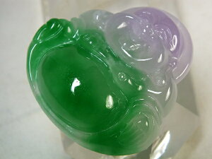 サイズ:41×41×厚11mm 重さ:26.1g ●緑色が綺麗なミャンマー翡翠。仄かにラベンダー色も混ざった珍品です彫られているのは、開運と、良縁・子宝の神、布袋様です。石コレクションやお守りに。上...