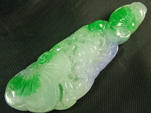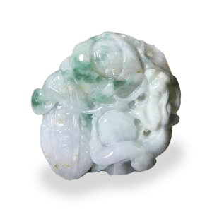 重さ:52.8g ●緑色が綺麗なミャンマー翡翠。仄かにラベンダー色も混ざっています。縁起柄の如意や貔貅(ひきゅう)などが彫り込まれています。石コレクションや置物に。上部に貫通穴が有るので下げ飾り等にもな