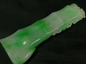 サイズ:103×39×厚15mm 重さ:103.9g ●緑色が綺麗なミャンマー翡翠。中国の縁起柄「天竹」が彫り込まれています。石コレクションや置物に。上部に貫通穴が有るので下げ飾りにもなります。