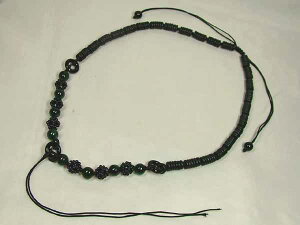 長さ:約460〜680mm 重さ:11g ペンダント用の飾り紐。黒粒石はオニキス、緑色の石はミャンマー翡翠です。先端の紐にお好みの石を通し、オリジナルペンダントを作成して下さい。後ろの部分で長さの調節が出来ます...