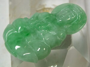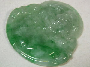 サイズ:高29×27×厚8mm 重さ:8.6g ●緑色が綺麗なミャンマー翡翠。彫られているのは、開運と、良縁・子宝の神、布袋様です。石コレクションやお守りに。上部に貫通穴が有るのでペンダントトップや下げ飾り等にもなります...
