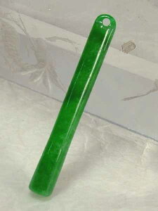 サイズ:長79×直径12mm 重さ:23g ●緑色が綺麗なミャンマー翡翠。濃いグリーンが、シンプルなデザインに勝るトップです。上部に貫通穴が有ります。ペンダントや下げ飾り等に。