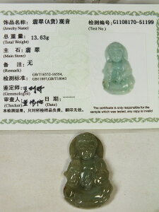 サイズ(約):52×39×6mm 【材質】天然翡翠(ジェイダイト、硬玉)・俗称「翡翠A貨」・完全無処理翡翠。 ●こちらは色・艶・彫り全て良いA貨と呼ばれるランクのミャンマー翡翠です。縁起柄の観音様が彫り込まれています(片面のみ)