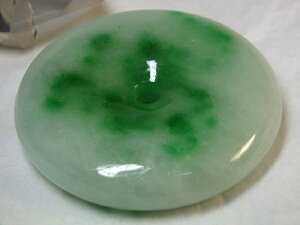 直径:55mm 厚さ:12mm 穴直径:5mm 重さ:79.1g ●緑色が綺麗なミャンマー翡翠。中央に穴が有るドーナツ型。石コレクションやオリジナルアクセサリー作り等に。 ●「平安」とは中国では旅人のお守りです...
