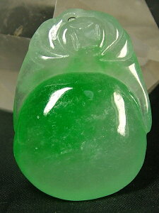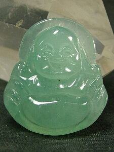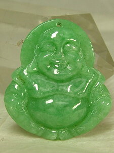 サイズ:高30×26×厚8mm 重さ:8.9g ●淡緑色が綺麗なミャンマー翡翠。透明感の有る氷種(アイスジェダイト)です。開運と、良縁・子宝の神、布袋様が彫り込まれています。上部に貫通穴が有ります。...