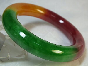 重さ:106.6g ●緑色が綺麗なミャンマー翡翠。紅色や糖色(蜜色)も混ざった珍品です。飾り彫りのないシンプルなデザインですが、一塊の石から作られた贅沢な逸品です。 ●中国では翡翠の腕輪は女性