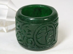 高30×厚6mm 重さ:36.7g ●緑色が綺麗なミャンマー翡翠。翡翠の魅力がタップリと詰まった個性的なリング。「福」字や如意などが彫り込まれた縁起の良い板指です。 ●板指とは親指に嵌める指輪。ちな...