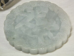 サイズ:直径52×厚6mm 重さ:38.2g 【材質】天然翡翠(ジェイダイト、硬玉)・俗称「翡翠A貨」。 ●こちらは完全無処理で「A貨」と呼ばれるランクのミャンマー翡翠です。「平安」と彫り込まれた縁起の良い牌子です(彫りは片面のみ)...