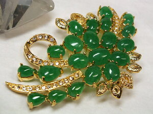 サイズ(約):63×41×厚(裏側ピン含まず)7mm 重さ:20.2g ●緑色が綺麗なミャンマー翡翠。21粒の翡翠を配した贅沢なブローチです。 ※金具は真鍮にメッキです。