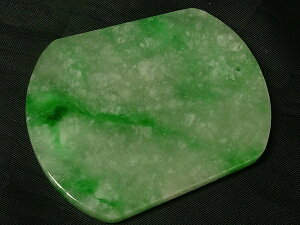 サイズ:54×43×厚5mm 重さ:31.6g ●緑色が綺麗なミャンマー翡翠。両面とも飾り彫りのないシンプルな牌子です。上部に貫通穴が有ります。石コレクションや下げ飾り等に。