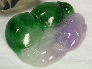 サイズ:46×34×厚10mm 重さ:24.1g ●緑色が綺麗なミャンマー翡翠。仄かにラベンダー色も混ざった珍品です。縁起柄の瓢箪や猿などが彫り込まれています。石コレクションやお守りに。上部に貫通穴...