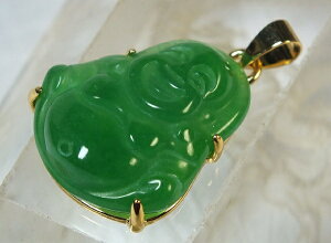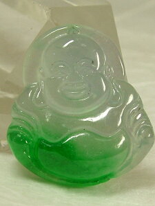 サイズ:26×23×厚7mm 重さ:7.6g ●緑色が綺麗なミャンマー翡翠。こちらはかなり透明感の有る「氷種」です。開運と、良縁・子宝の神、布袋様が彫り込まれています。上部に貫通穴が有ります。ペンダントトップや下げ飾り等に...